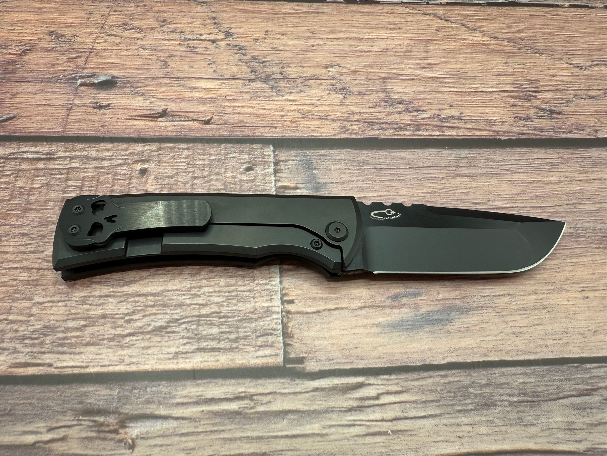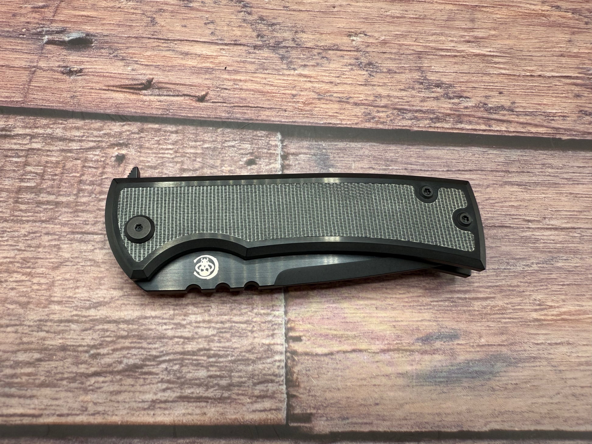 - Handle: Black titanium with a black micarta front handle inlay, offering a secure grip and a striking, modern look.