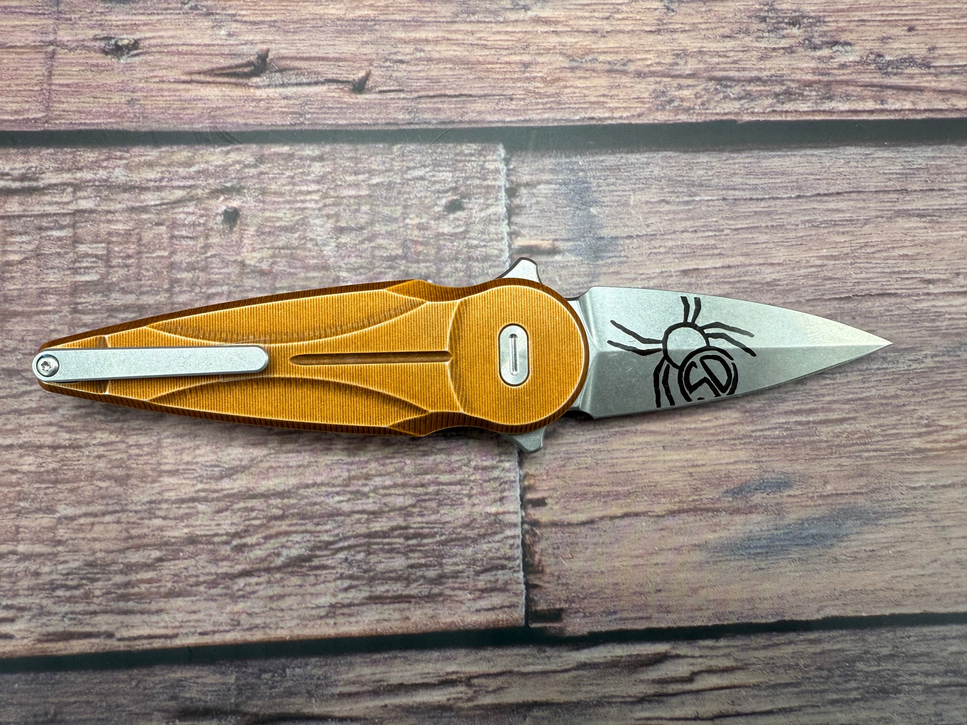 The blade is crafted from satin finish N690Co steel for edge retention and corrosion resistance, while the handle combines a copper stonewash finish on durable aluminum for a distinctive, rugged look that ages beautifully.