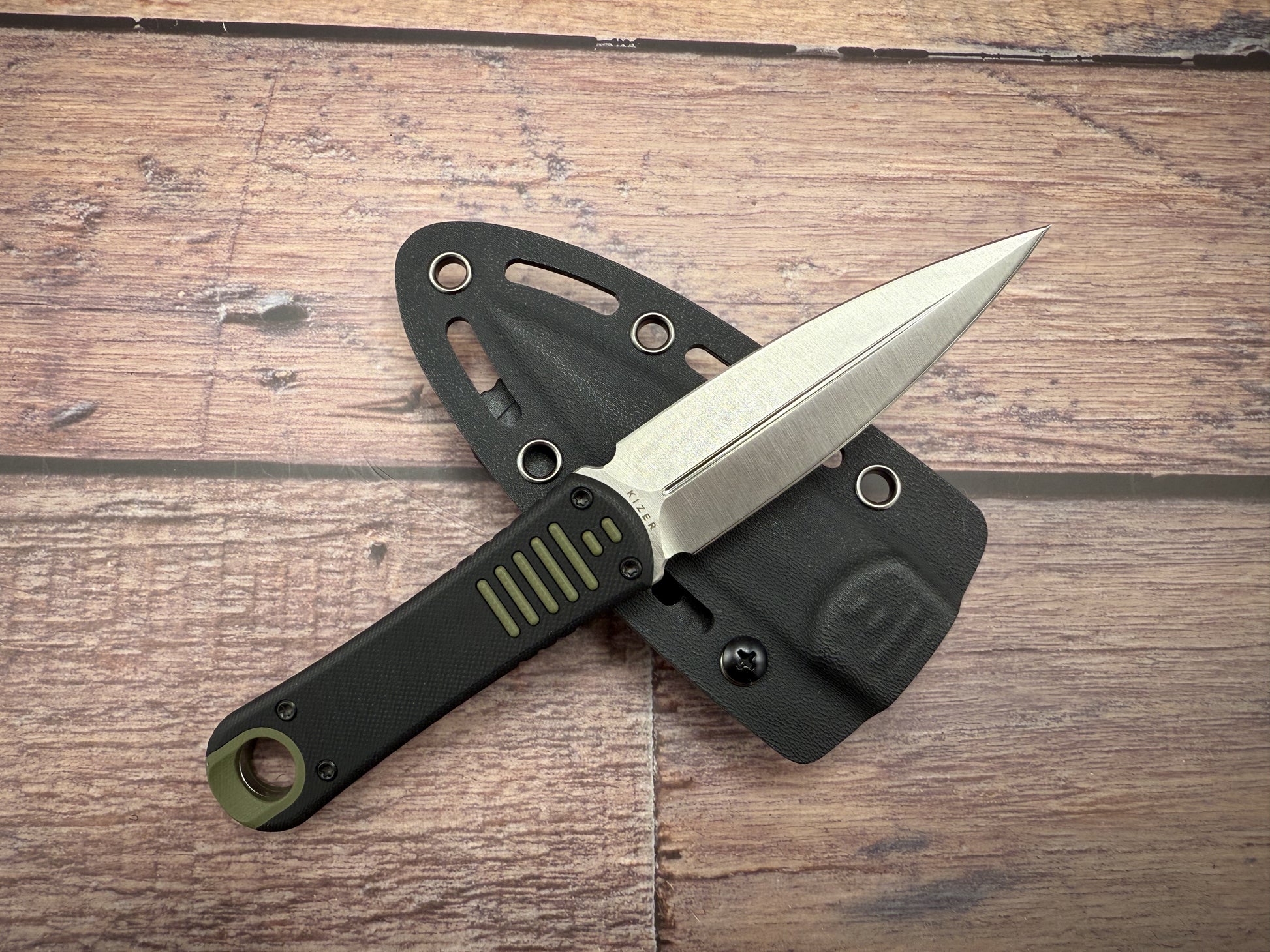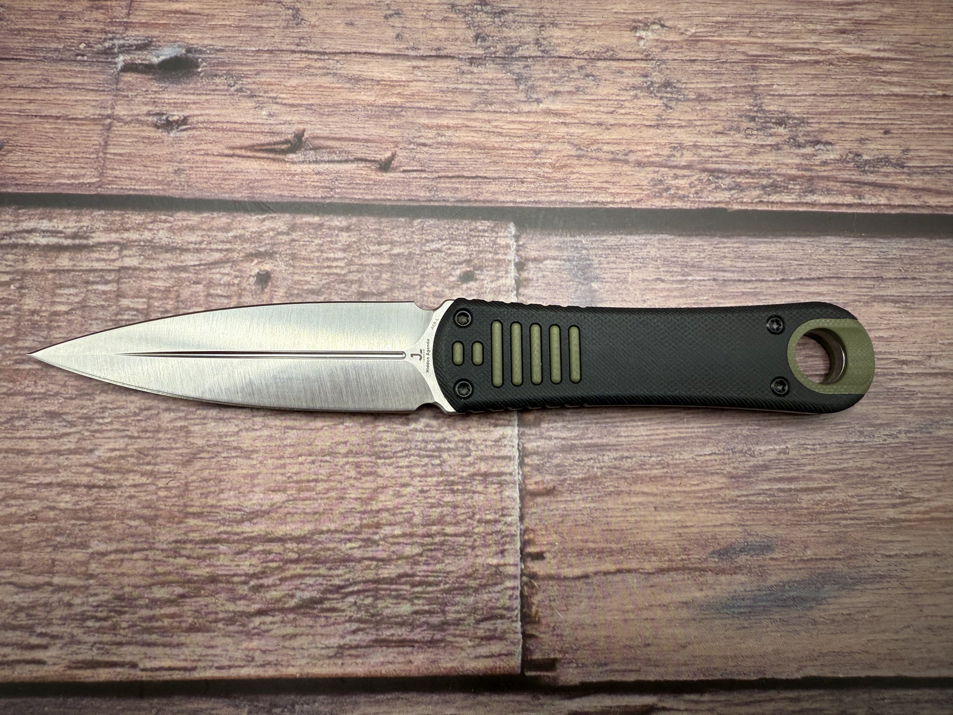Designed for outdoor enthusiasts, survivalists, and tactical users, Hidden Agenda delivers dependable performance in a compact package. The satin blade reduces glare and hides wear, while the dual-edge design expands your capabilities for a wide range of utility tasks. The Black and OD green G10 handle offers excellent grip texture and durability, even in wet conditions, and the full tang construction enhances rigidity for heavy-use scenarios. The lanyard hole adds carry customization, and the included Kydex sheath ensures your blade stays secure on your belt for quick access when it matters most.