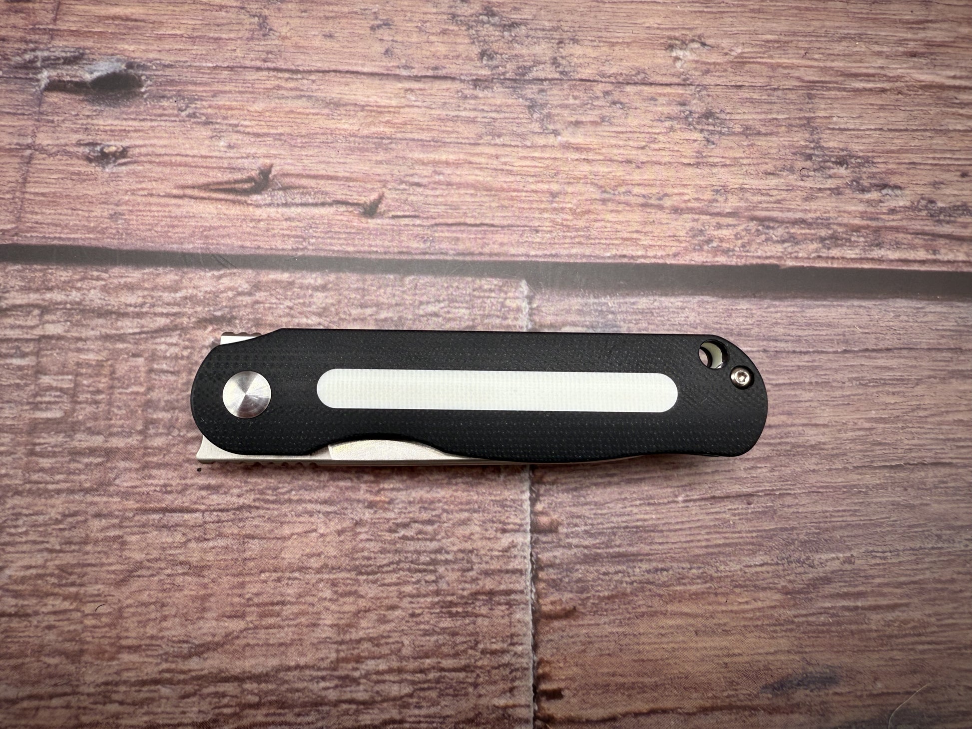 - Handle: Black and white G10 scales provide a secure, grippy feel in any weather.